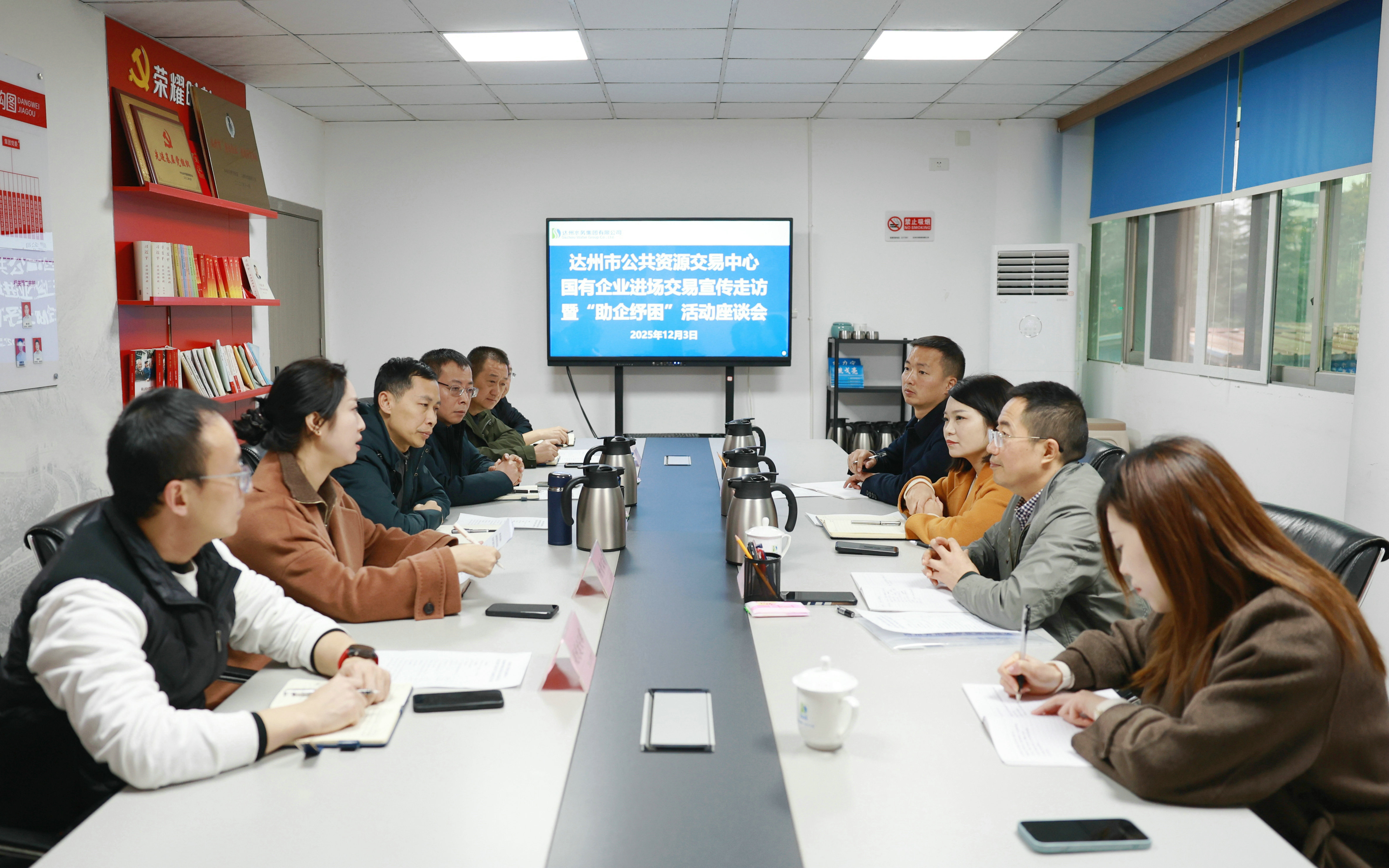12月3日上午,市公共資源交易服務(wù)中心副主任陳曉云帶隊(duì)赴達(dá)州水務(wù)集團(tuán)開(kāi)展國(guó)有企業(yè)進(jìn)場(chǎng)交易宣傳走訪暨“助企紓困”活動(dòng)座談會(huì),集團(tuán)黨委委員、副總經(jīng)理?xiàng)盍?,黨委委員、副總經(jīng)理、財(cái)務(wù)總監(jiān)朱亞成和集團(tuán)相關(guān)部門(mén)參加。